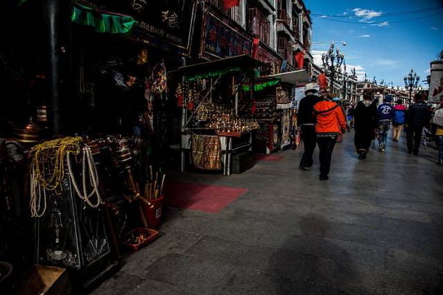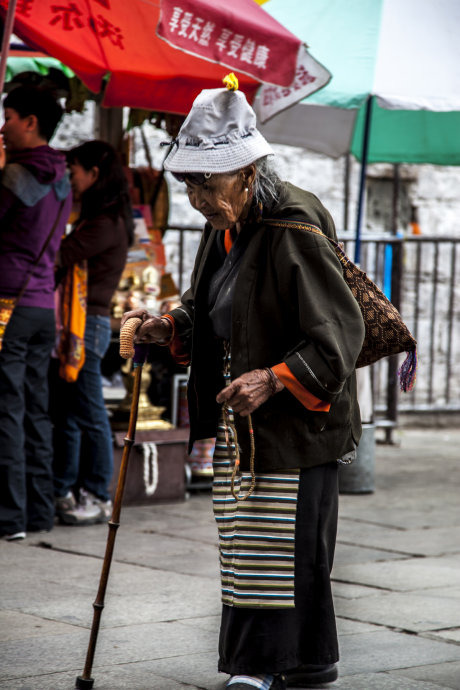 如果不是转经,这路条真是没有什么可转的,全都是小商铺,商业味道远远超出了宗教的味道。以其转八廓街,不如坐在一处,看一看那些转经的藏民。所以在一处画店外边坐了一会,看着一批批转经的藏民从自己的眼前经过,体会一下他们的那种虔诚,那种朴素而坦然的心态。在这些人的脸上,你看不出有什么对宗教深刻的认识,但是,他们就是那么的自然而然地信着、做着他们认为应该做的事。在拉萨转经的人群里,老年人居多,妇女居多,当然,中年人,男人也有。但是,在转经的人群之中,你难发现那些穿着时尚的,很难分清藏族还是汉族的年经人。而在商店、快餐,甚至广场上,这样的年轻人,您却会遇到很多。