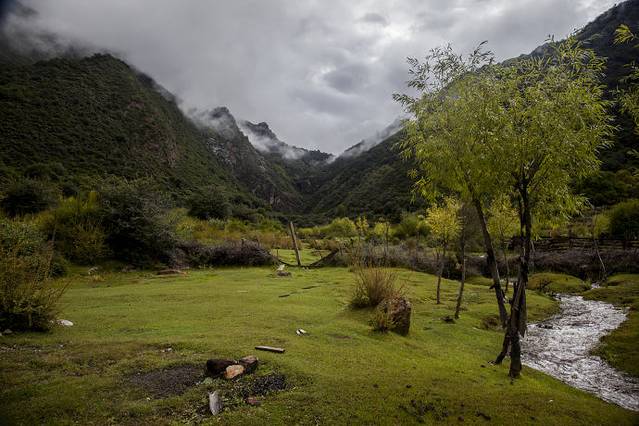 有一处景观台位置更接近江面。此处的江面已经接近大拐弯处,河道变陡,江水泛着水花,变得有些湍急。在观景台一侧,还有一条溪水从高处冲下,清清的溪水,冲击着小溪中的一块块大石,飞溅起晶莹的水花。望着四周茂密的植被,脚下踩着软软的,像似苔藓一样茸茸的矮草,感觉一下,想象一下,世外桃园,人间仙境不过如此。空气是那么的清馨湿润,这样的地方,人们所想要的什么负氧离子浓度一定非常高。除了海拔稍高之外,温度、湿度,阳光,这里都不缺少,这种地方一定特别适合人生存。要不那个英国的麦克马洪,怎么把山那一边,比大峡谷地理条件更好的地方都划给了印度呢!