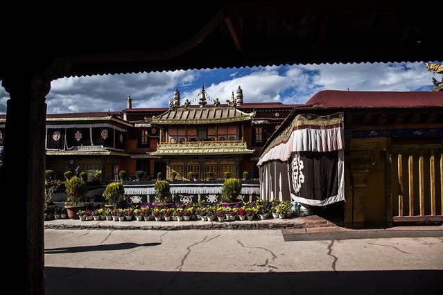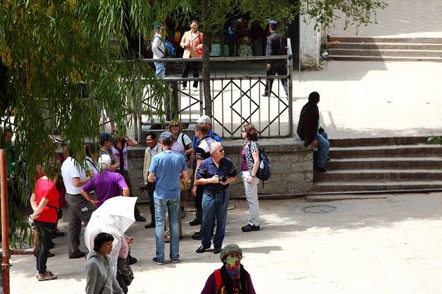 在房顶上拍了一些照片就从寺里出来了。这里也补一句,大昭寺作为一个重要的旅游景点,每天有很多游客。旅游的人购票是八十五元一张,而藏民,特别是朝拜的藏民则不用购票。他们可以从特殊的通道进入到寺里。