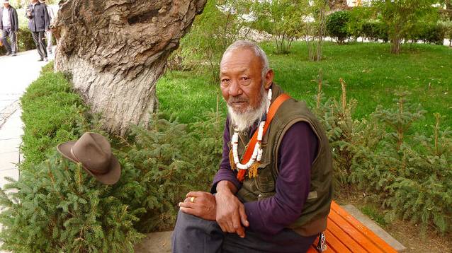 走到布达拉宫侧后面的时候,因为还是有些高原反应,想在路边休息一下。这时正看到路边座椅上有一位老藏民在休息,就停了一下来,坐到了他的身边,和他聊了几句。