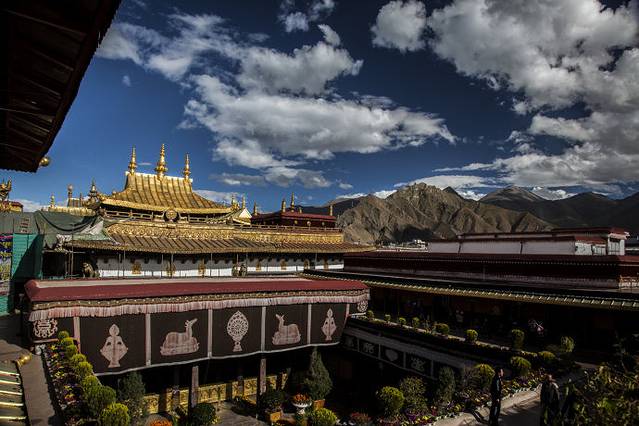 出了主殿,爬到了大殿的顶部。这些部分是可以照相,可以登高远望的。站在大昭寺的房顶上,可以清晰地看到布达拉宫,也可以看到拉萨市区外的群山。大昭寺大殿的金顶,和一些金色的法器,在阳光的照射下熠熠生光,很是抢眼。拉萨或者说西藏的空气透明度非常高,站在高处,抬眼一望,就是十几公里,没有一丝的雾霾。当时也看了下手表,当时已经快六点了。拉萨与北京有两个小时的时差,北京时间五点多,相当于拉萨的三点多,所以阳光还是非常强烈。