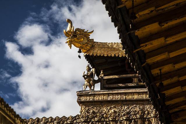 在大昭寺屋顶看远处的群山,金色的屋顶在群山的映衬下,熠熠生光。