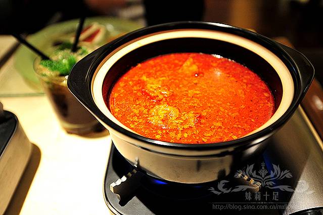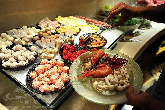 共有七种不同口味的亚洲特色锅底:日式辣椒牛尾清汤锅底、顶上清汤底、四川酸辣锅底、中式滋补养生汤底、越式鲜虾汤底、娘惹叻沙汤底、广式粥底。服务员热情推荐娘惹叻沙汤,比较泰式口味,喜欢酸辣的话可以选择,我来了一份,果然大赞啊!我基本一晚上光喝汤了……服务员给我加汤不知多少次……最最重要的是,七种锅底随便换,不额外收费!