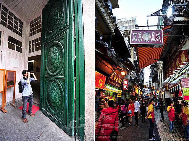 离开玫瑰堂,向大三巴进发。狭窄的上坡小路熙熙攘攘,各种特色店铺在招揽生意,以小吃居多,其次是纪念品。时间紧迫,先把目的达到了再回来逛。