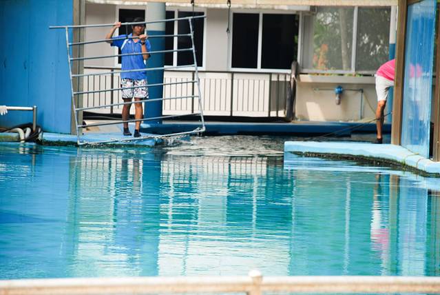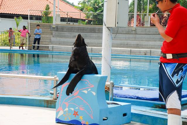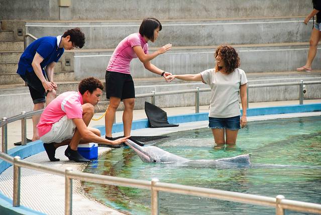 从广场下去坐公交到西乐索,下车就是新加坡海底世界。现在觉得稍微有点儿后悔去,这里的海底世界和北京富国海底世界可差远了,但是有很稀有的粉海豚。粉海豚的表演是有时间的,忘记照了但基本上是2个小时一场,大家来早了愿意可以等等顺便歇歇。因为人很少,所以有机会和海豚近距离接触。
