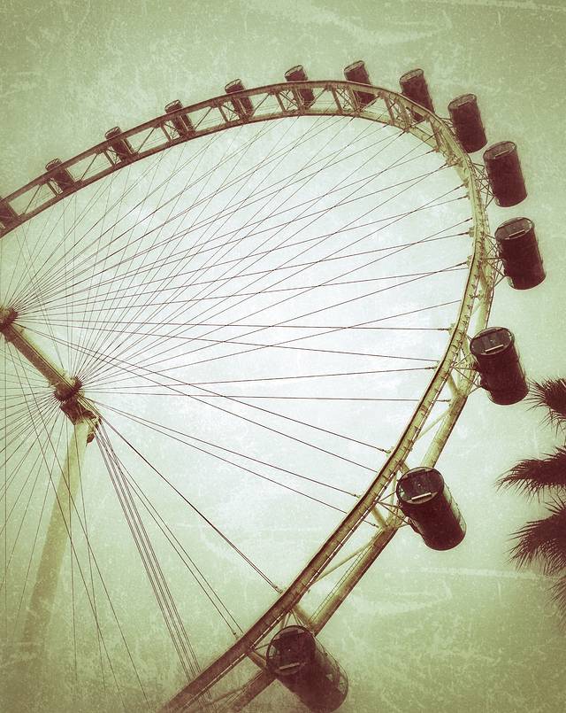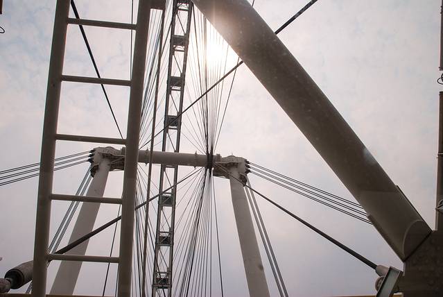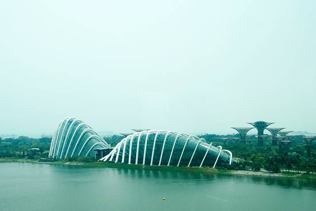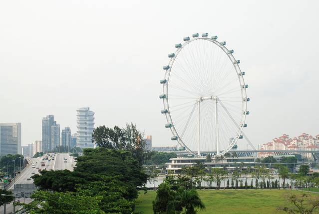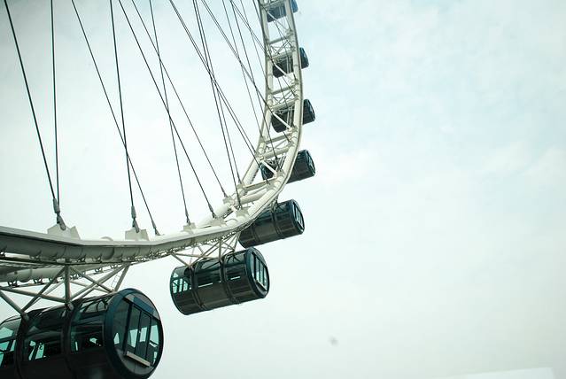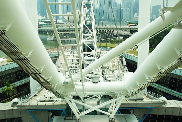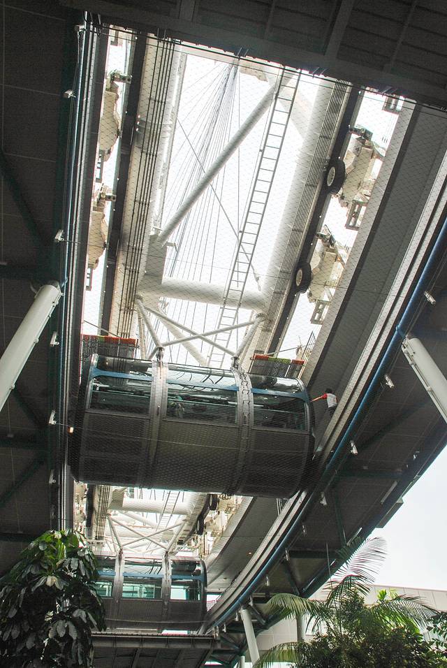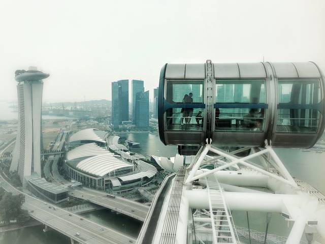 从滨海湾路过漂浮在水上的足球场,再走10分钟左右就到了著名的摩天轮。买票进去之后,先是一个小博物馆,展示整个摩天轮的运作原理和成就,随后就可以进去坐啦。大概6个人一辆。里面很宽敞,而且特殊材料制成的窗户可以抵挡阳光。风景还是高点儿更好!