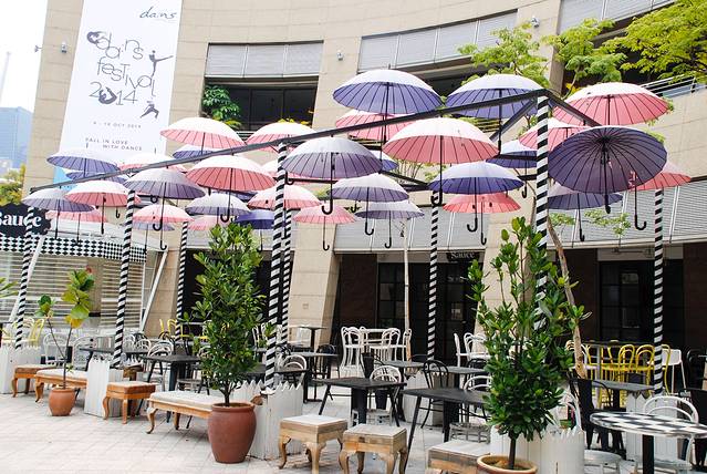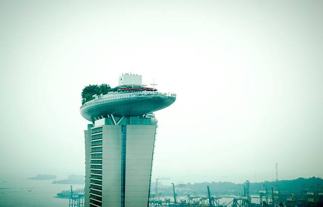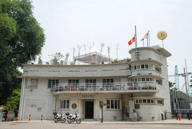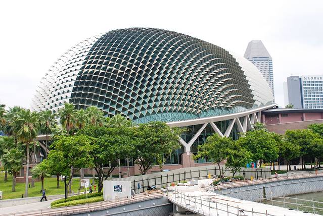 从剧院出来,再从桥上过去向滨海湾(Marina Bay)的方向走去,因为城市很小,景点和景点之间连的都很近。路上看到了这个别致的小房,仔细一看,才知道这是一家超级别致的星巴克咖啡店。