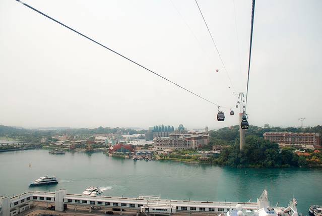 一早坐地铁黄线或者紫线到港湾站(Harbor Front),从出地铁之后就会有圣淘沙缆车的标志。如果没有记错的话,缆车没有单程的票只有往返,大概35新币左右。除了缆车进入圣淘沙岛之外,还可以做圣淘沙捷运,票价应该是4新币。除了这体力好的朋友还可以从栈道上走过去,要交1-2新币的进岛费。当然我做缆车过去,就不需要进岛费了。另外在卖缆车票的地方还有那种套票,和岛上的一些游乐设施绑定啊之类的可以选择。