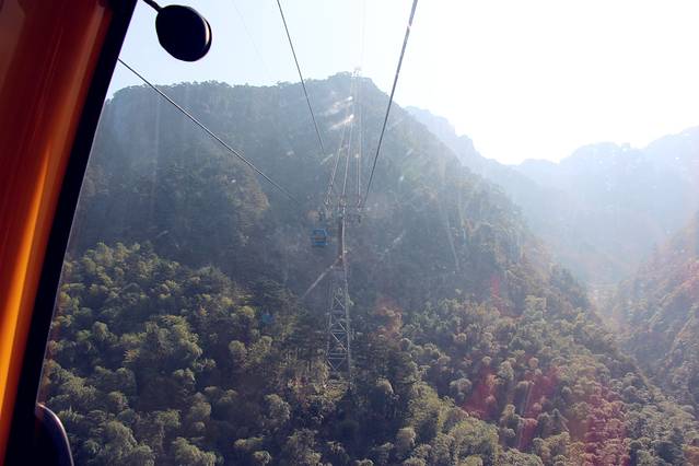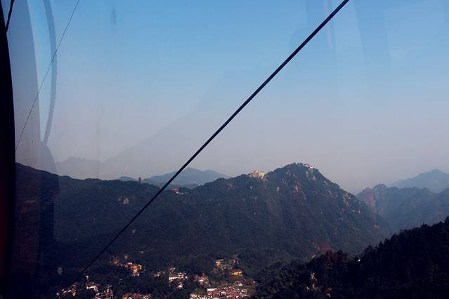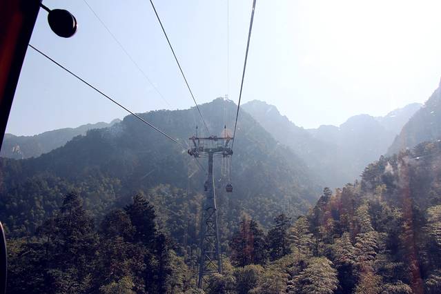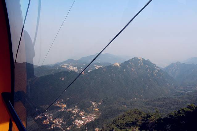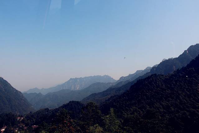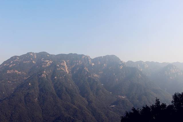 对面就是徒步攀登天台峰的路线,从下至上而行;图片只是大山的上半部分,下半部因树林遮挡拍不到,古拜经台的右侧平行方向,是游客乘坐缆车的方向,这段路需要游客徒步行走方能到达下山的缆车站。