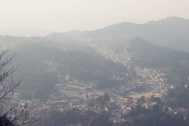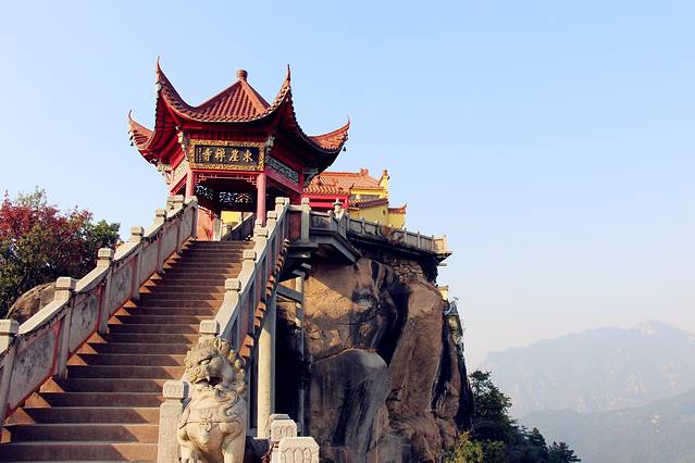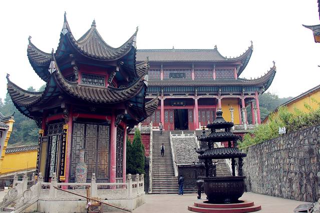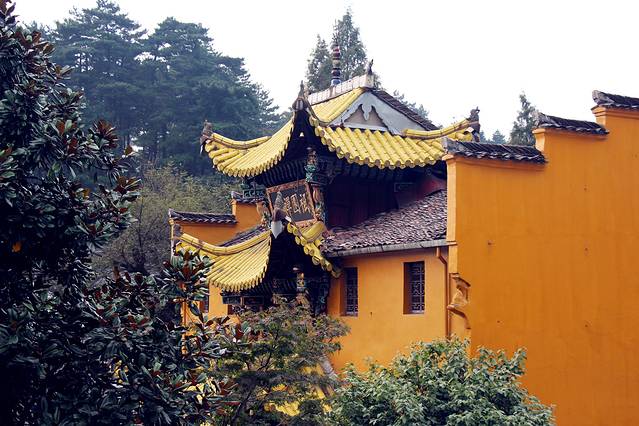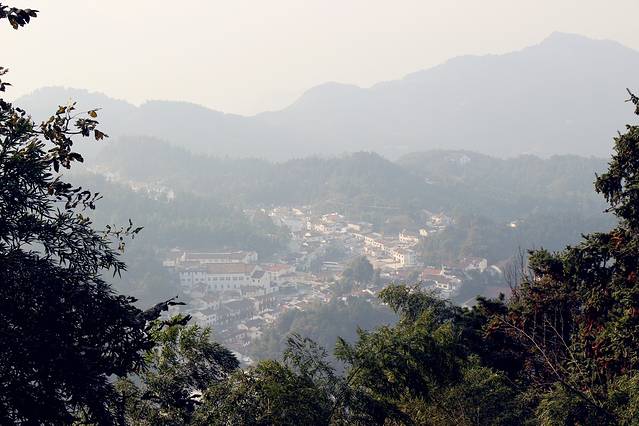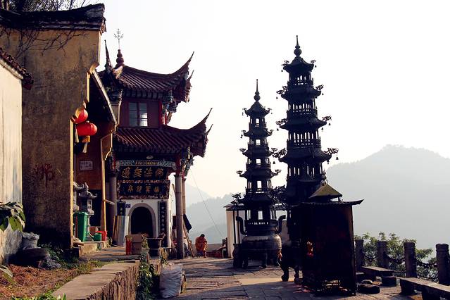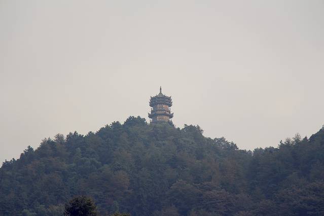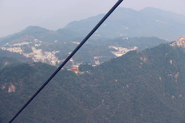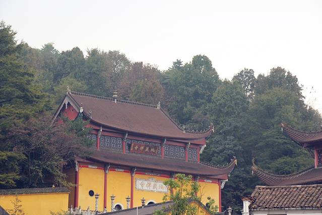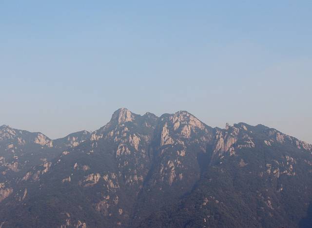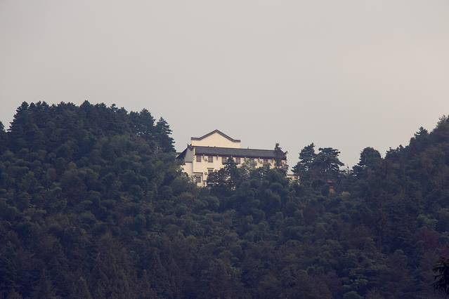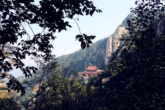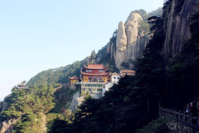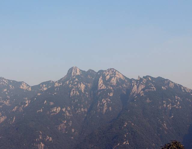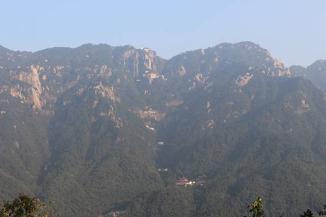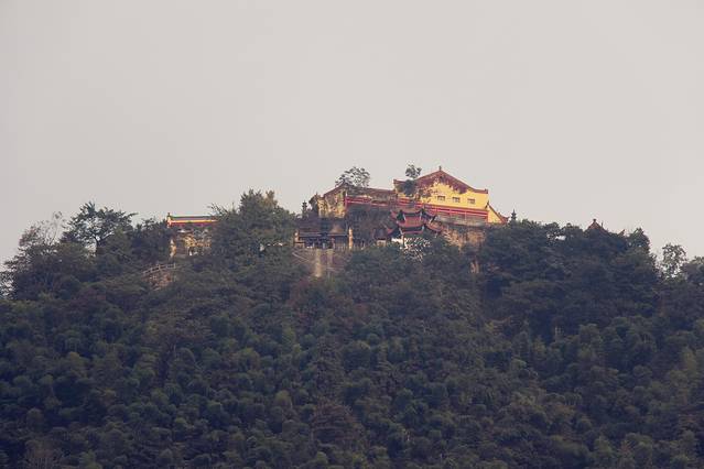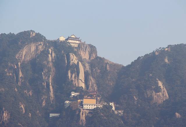 在东崖禅寺到万佛塔的途中拍照的九华山天台峰,山上的殿宇是天台寺,下面的殿宇是古拜经台;借用长焦拍摄。