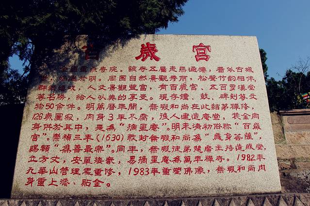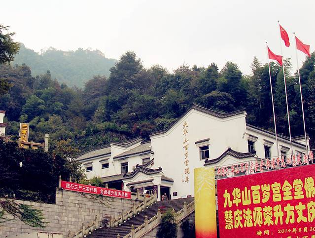 百岁宫,始建于明代万历年间,初名摘星庵,又名万年禅寺。与祗园寺、东崖寺、甘露寺同为九华山"四大丛林"。百岁宫内供奉着无瑕和尚的真身,无暇和尚圆寂于天启三年(1623年),享年110岁,世称百岁公。