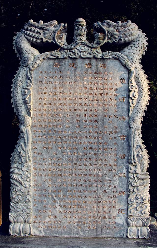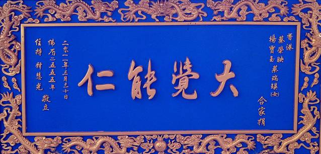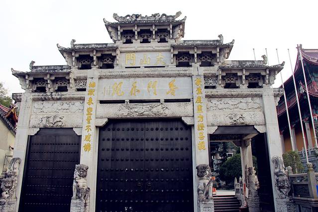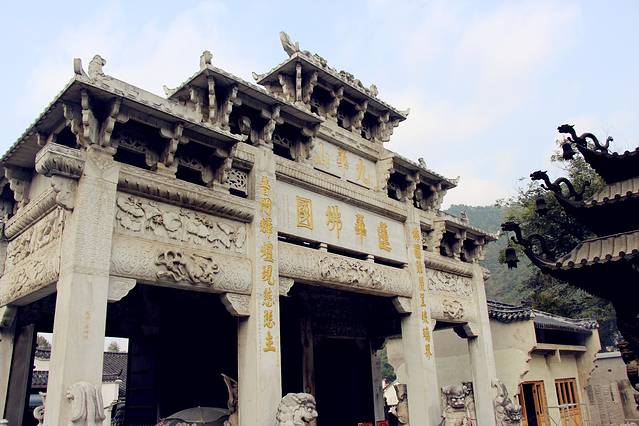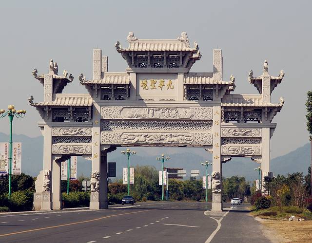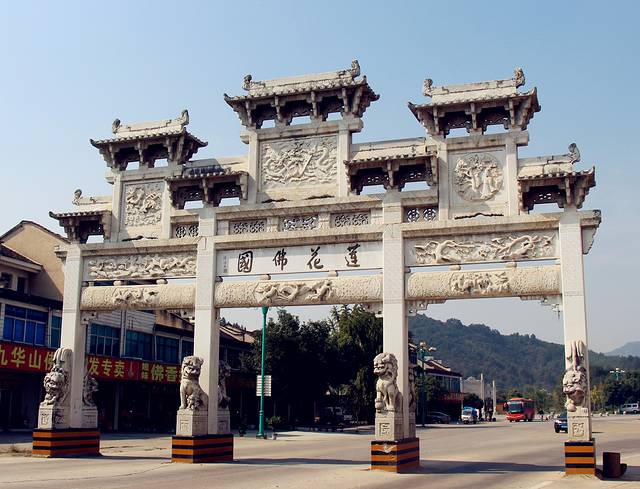 大悲宝殿山门前的牌坊,上面刻有:九华山·莲花佛国