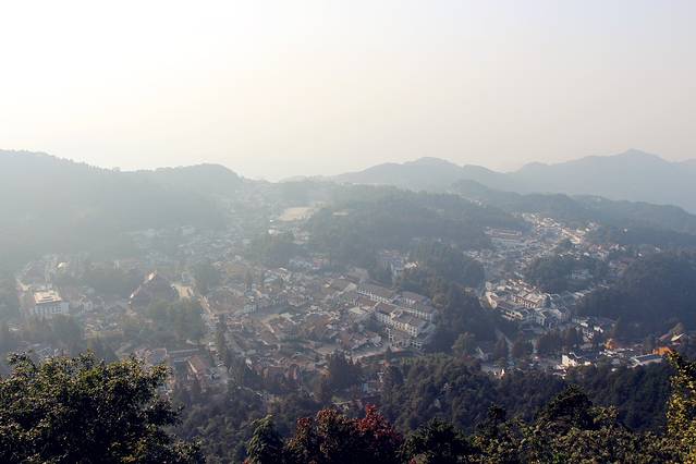 护国月身宝殿山门前的广场;眺望远方,从左至右能看到:东崖禅寺、回香阁、万佛塔
