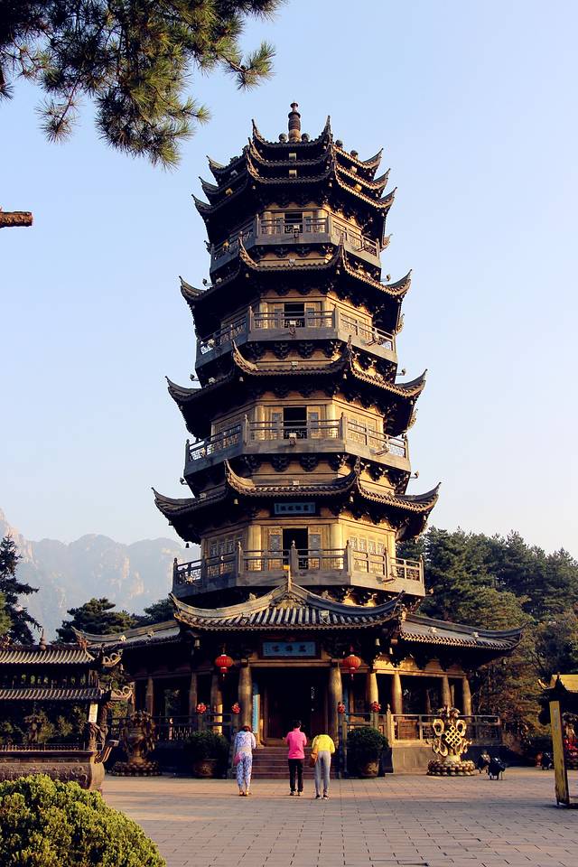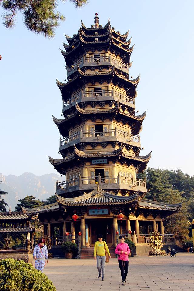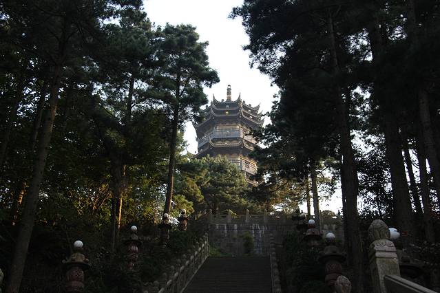 穿越过这片松林便是万佛塔,万佛塔坐落在回香阁、迎客松前的芙蓉峰上,始建于2003年,2006年建成。万佛塔内供奉有药师佛和如来佛。最美的时刻是每月的阴历十五前后的夜晚,宝塔通体流光溢彩,灵珑剔透,悬在半空中,月色如银,撒落九华街,与九华街的灯光相辉映,给整个莲花佛国九华山披上了浓郁般的神秘之感。