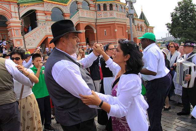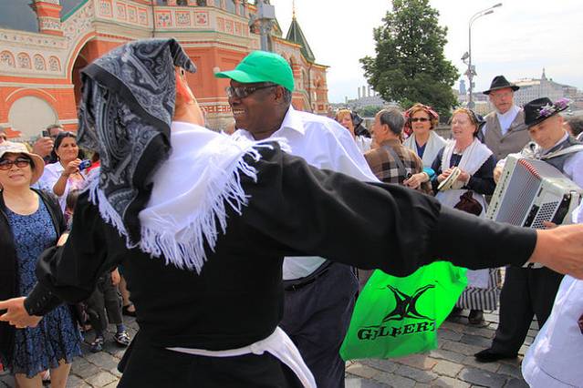 歌声把邻近的游人吸引过来,异国游客们情不自禁地加入到俄罗斯老人中,和着乐曲跳起舞来。