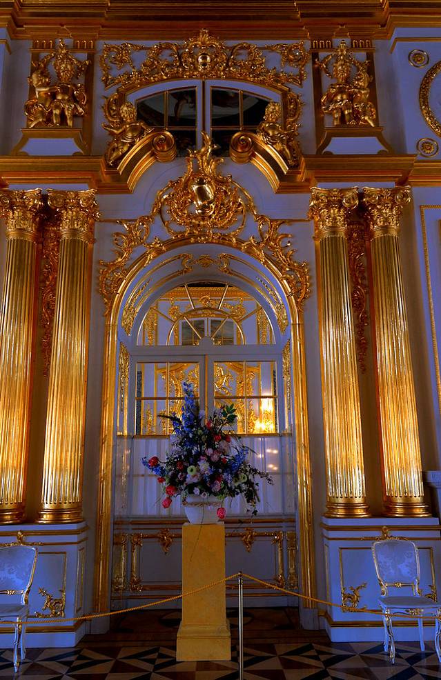 宫殿的内部装饰很有特色,屋顶和屋檐上镶有许多精美的雕刻,窗户与窗户之间还有许多陶制的浮雕。楼梯和墙壁算得上金碧辉煌,加上天花板上充满宗教色彩的油画,更显得气势磅礴。华丽房间里的古典式家具、名贵的瓷器,还有那些彼得大帝夫妇曾经使用过的生活用品,将历史的沧桑岁月不经意地呈现在我们面前。