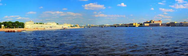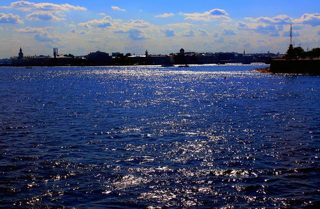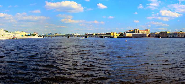 涅瓦河是宽阔的,在它的主河道两岸矗立着无数闻名遐迩的建筑,这些建筑像贵重的珍珠把这座城市曾经的故事和今天的风韵串在一起,在河水的波澜里,显得那么天高地远。