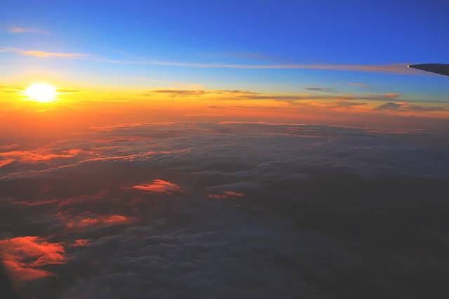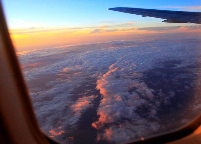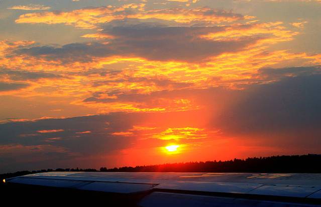 莫斯科时间晚上10点钟起飞的mu592航班迎着夕阳飞上蓝天,在金色阳光下天空显得很美
