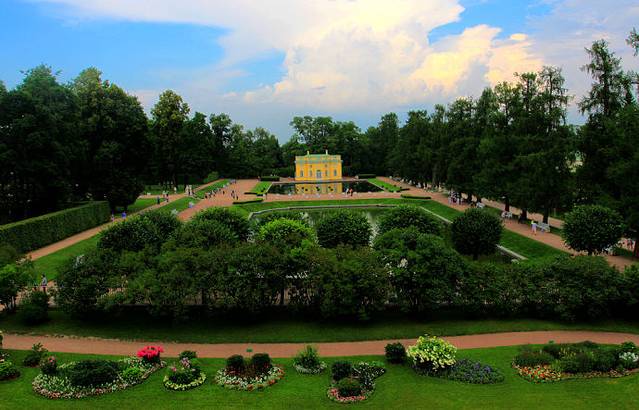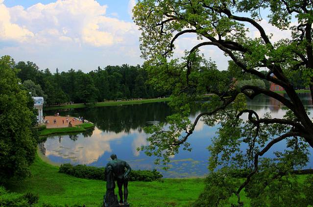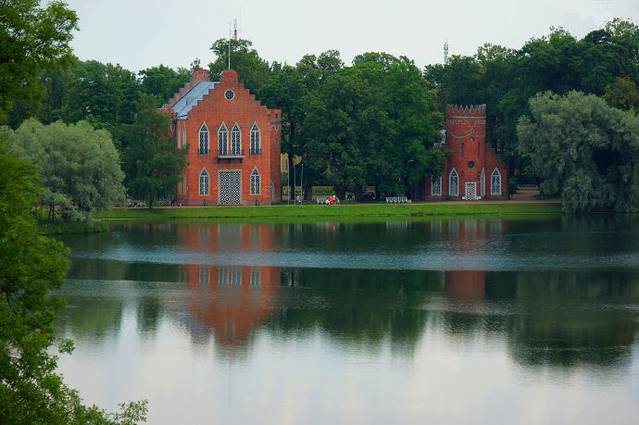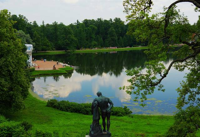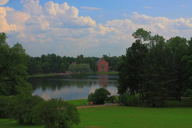 1762年叶卡捷琳娜二世登上皇位宝座。她成为皇村第三任主人后不久,遂颁诏将原来呈几何形布局的花园改建成时髦的英国式园林。因为此时欧洲的文化潮流已演变为以自然为本的古典主义,这一理念被引入叶卡捷琳娜园林艺术中。于是,蜿蜒小径代替了笔直的林荫路,修剪整齐的草坪变成厚密茂盛的草地,方圆规矩的池塘改为轮廓曲折的潭洫,任其自由生长的团团树林仿佛天然生成。