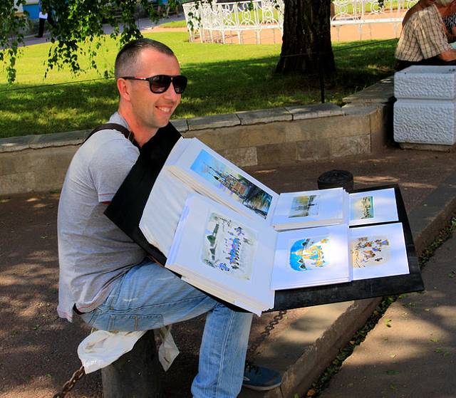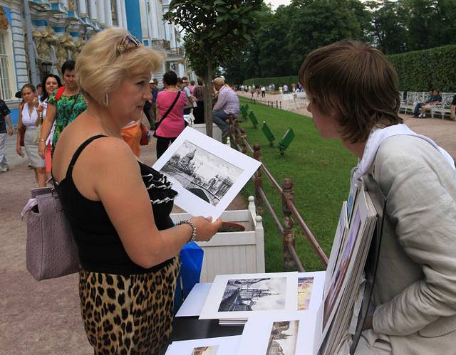 大宫殿前兜售纪念品的小贩。尽管其中的一些明信片、邮册还是有收藏价值,鉴于导游一再作过“安全教育”,大家都“敬而远之”!在圣彼得堡的各个景点,偷儿出没,他们专挑中国游客,下手极快,防不胜防。有些偷儿就是用出售纪念品作掩护。