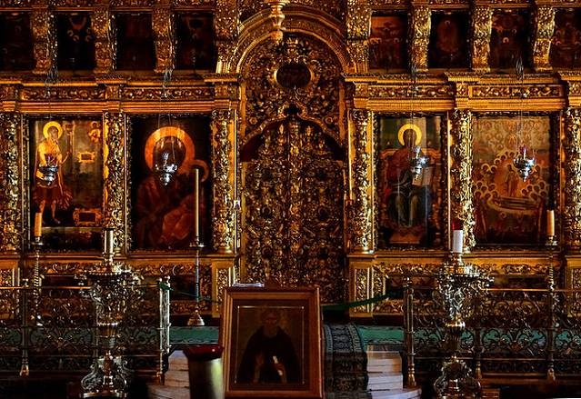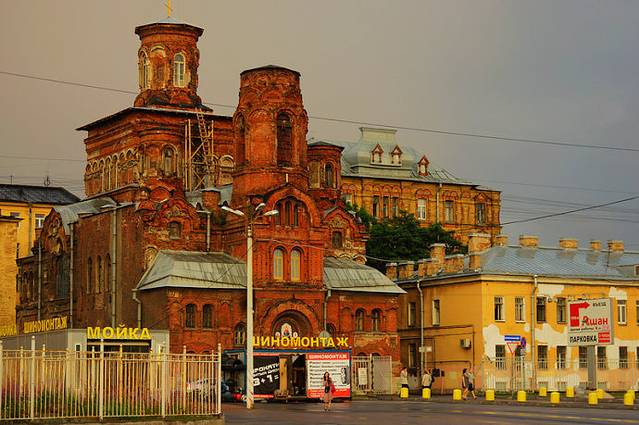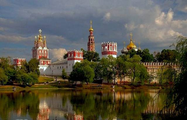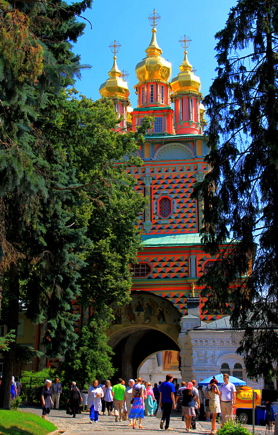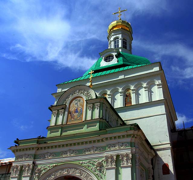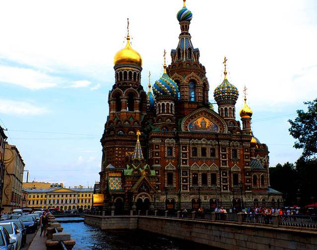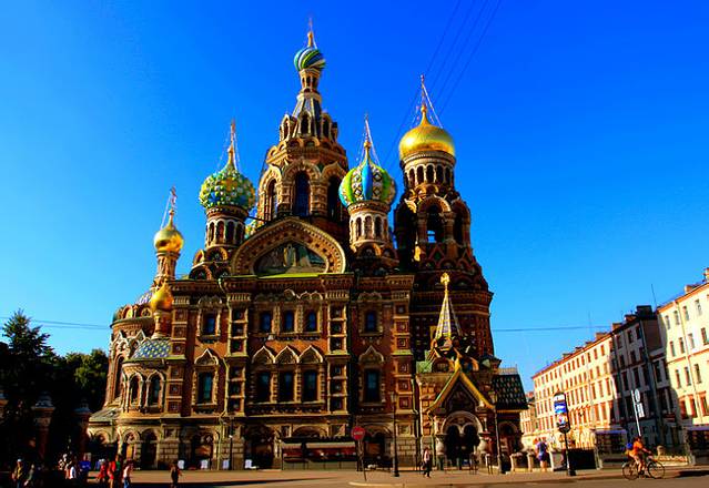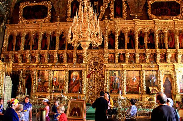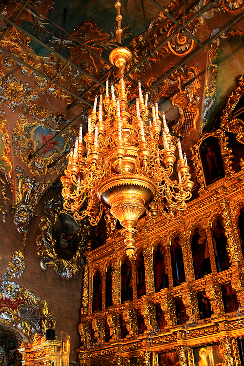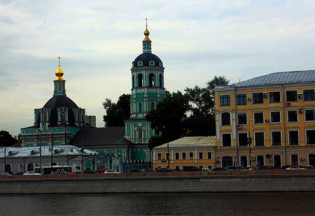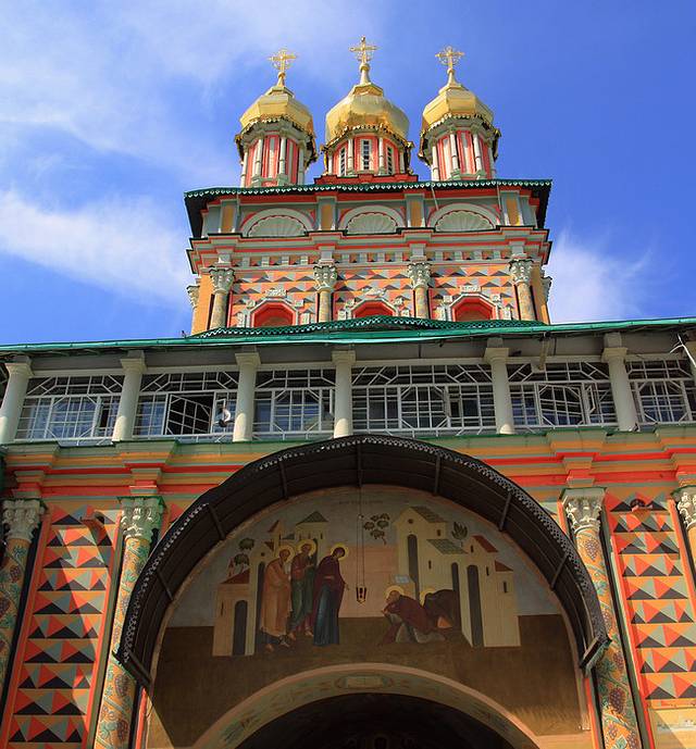 这座教堂中间是一个带有大尖顶的教堂冠,中心塔从地基到顶尖高47.5米,鼓形圆顶金光灿灿,8个带有不同色彩和花纹的小圆顶错落有致的分布在它的周围,再配上九个金色洋葱头状的教堂顶,绝妙无比。