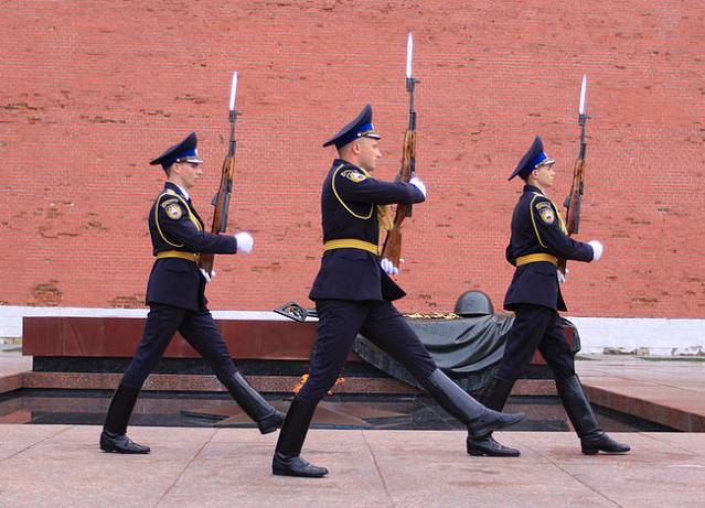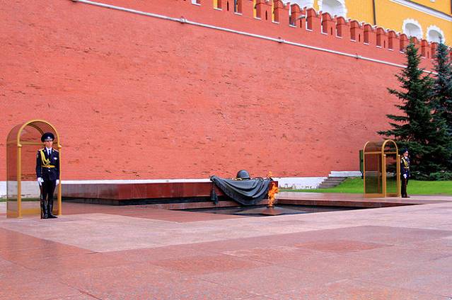 离朱可夫元帅雕像不远处的红墙脚下,是为纪念反法西斯战争牺牲的无名英雄而建造的无名烈士墓,在钢盔和战旗的雕像前,是永远燃烧的长明圣火,象征着为国捐躯的烈士们的斗志和精神永远不灭。守卫无名烈士墓的“帅哥”卫士在每小时的整点换岗一次。
