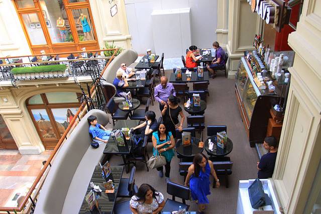 “古姆”分为三层,由一千多间专卖店组成,既有俄罗斯特色的瓷器、工艺品、服装、百货等精品,又荟萃了琳琅满目的进口商品。多年来,“古姆”一直以它的巨大和齐全立于不败之地,即使经历了经济萧条,也坚韧地挺了下来。