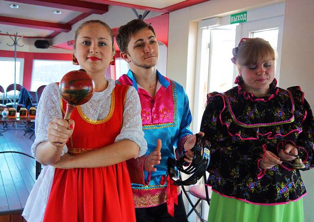 在手风琴伴奏下,演员唱的都是苏联时代的老歌曲,什么《莫斯科郊外的早晨》、《三套车》、《喀秋莎》、《红莓花儿开》、《纺织姑娘》等等,都是上世纪中页中国人耳熟能详的歌曲,能在它们的“故乡”聆听到俄罗斯人演唱,莫不十分开心。舞蹈演员的俄罗斯民间踢踏舞跳得很投入,非常精彩。不时穿插的演员和中国游客的互动,更是把演出推向高潮。