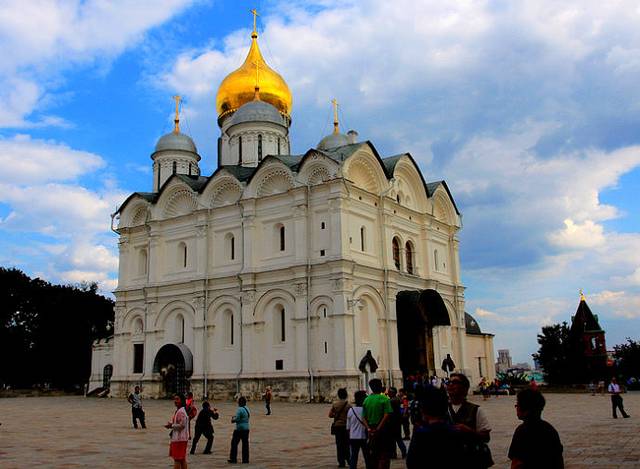 广场的右边是天使报喜教堂,又名布拉戈维先斯基教堂,规模不大,却最具魅力,这是皇宫中家族用的礼拜堂,也是举行皇族婚礼的地方,里面保留着俄罗斯最古老的圣像壁画。