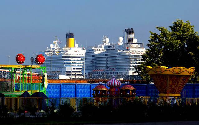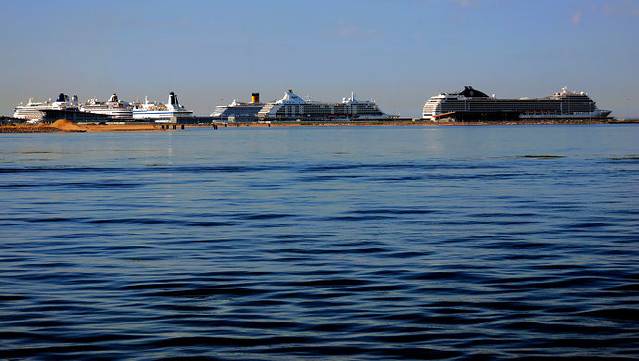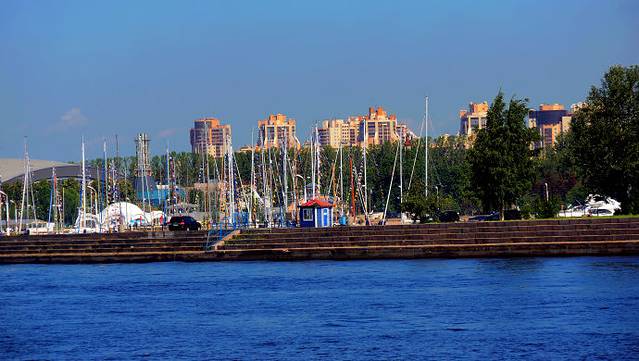 涅瓦河出海口__波罗的海芬兰湾,天水一线。岸边上停泊着从北欧过来的豪华游船,每天都有大批外国游客乘船来圣彼得堡旅游。