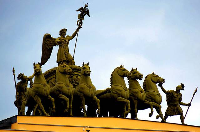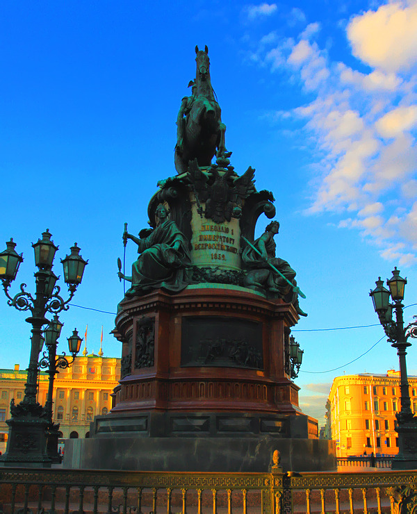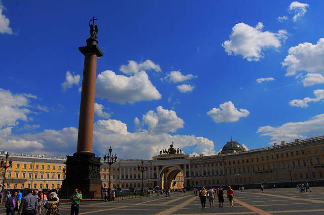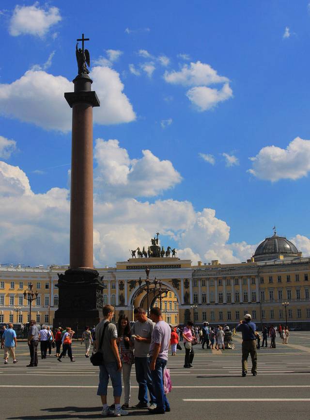 冬宫广场的面积比莫斯科的红场还要大,广场中央建有亚历山大圆柱,是为纪念1812年反击拿破仑的战争胜利而建造。它高47.5米,柱上方站立着天使铜像,据说是以沙皇亚历山大一世为原形。圆柱中心是一块红色花岗岩,直径约4米。令人感到惊讶的是,它虽重约600吨,但底部并未用任何方式固定,底部也无任何支撑。