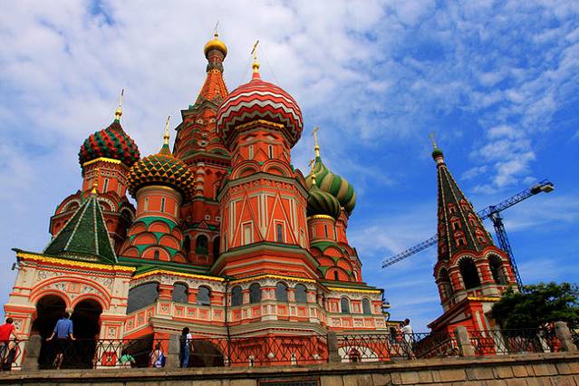 红场南面的圣瓦西里大教堂是全俄罗斯最漂亮的大教堂,也是俄罗斯最著名的建筑之一。显示了16世纪俄罗斯民间建筑艺术风格。它是伊凡大帝为了纪念1552年战胜喀山鞑靼军队而下令建筑的,于1560年建成。