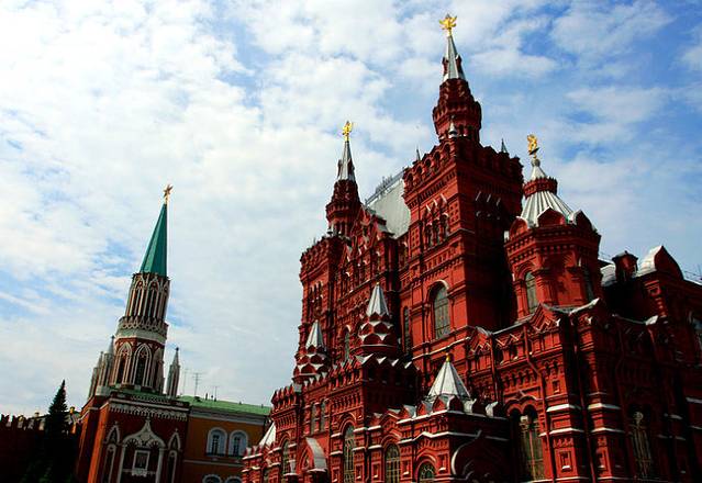 红场北面,是一座三层红砖楼,其式样仿照古代俄罗斯建筑,南北各有尖塔8 座。这是建于19 世纪的历史博物馆,里面收藏有450 万件展品。