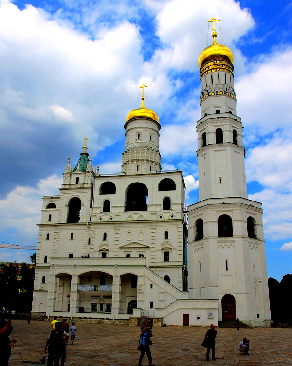 白色金顶的伊凡大帝钟楼是克里姆林宫最高的建筑,建于1505—1508年,高81米,里面藏有50多口铜钟。