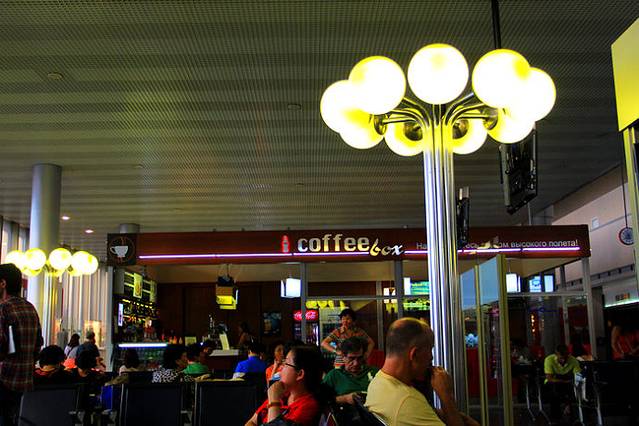 候机厅的装修还是比较豪华的,一色的赭色花岗石地板,新颖的吊灯。也许是俄国人的商业意识太强,候机厅的场地大半都隔出来作商场、酒吧、咖啡厅了,候机场地小,座椅挤在通道和角落上,座位也不够,不逛免税店、不进咖啡厅的旅客只好坐在楼梯上。