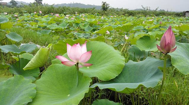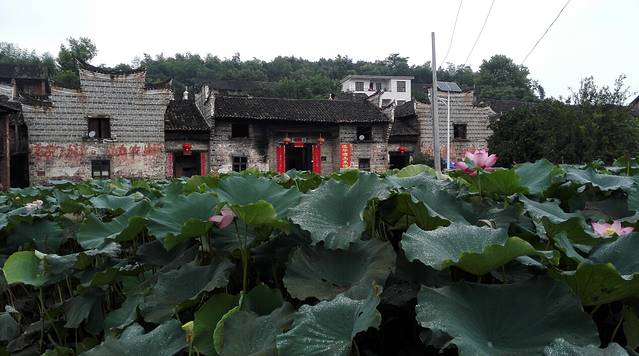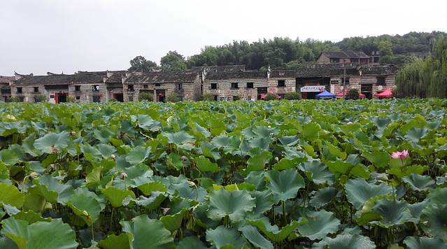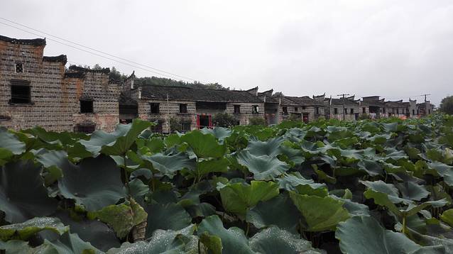 本来目前荷花已过季,心里期望抓个零落的花尾巴即可,但古村仍有数百亩盛开的荷花,虽难说繁盛,但也亭亭净植缀红处处,红花与碧叶接天,又多又好看。古居前的荷叶为二年生,叶高过人,可惜大多已成莲蓬,所以未见荷花簇拥之下的老屋。土菜馆的曹老板说,6月中旬是最佳时间,看来只待明年了,生活中只要有所期待,便觉得日子好过一些。