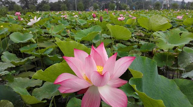 流华湾古村在资兴市的三都镇,正在搞荷花节,那距和平村咱篱笆客栈不远,单程30公里。昨天下午那场大暴雨,已预支了好几天的雨量,虽然清早天空阴沉,仍骑车前往。