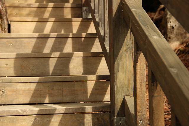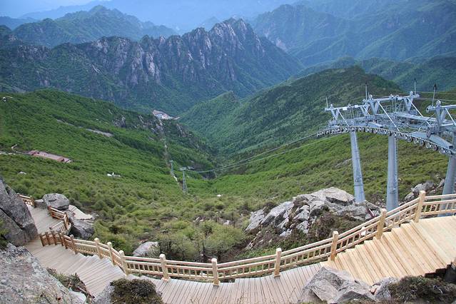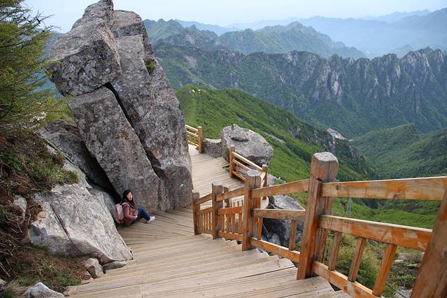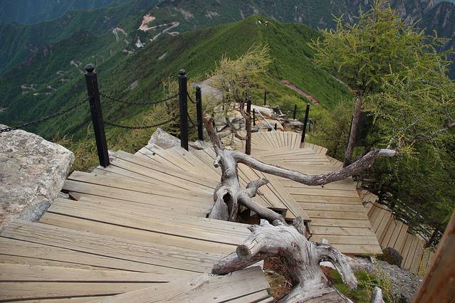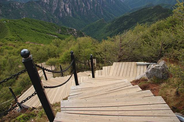 我们要顺着木台阶下山了。一边是石壁,一边是深谷。