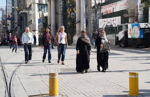 我们从色雷斯方向一路过来,在距离伊斯坦布尔市区还很远的地方,便有连续、延绵不断的灯火,使人感受到这里城市化的深度和商业的繁荣。伊斯坦布尔街头,长长的轨道车在城市中心蜿蜒的街道上和人流中穿行;穿着时尚的本地年轻人,混杂在大量游客中来去匆匆;在许多地标性的繁华地段,更是各色人等穿梭期间,日夜沸腾;象征重建罗马辉煌的索菲亚大教堂,与其对面不远处的蓝色清真寺争妍斗丽,又像两个巨人俯瞰着这座城市;街边不时散落着的罗马时代的建筑残片,以及竖立在古跑马场上的埃及方尖碑,都在提醒着人们这座城市历史的悠久。由于奥斯曼时代才过去不到百年,其遗风及留下的东西自然也多。尽管这里已不再是政教合一的伊斯兰教国家,但穆斯林还是占了绝大多数。大街上,妇女戴头巾是很自然地事,但是在这座城市里,这件事似乎也有得商量。实际上,许多妇女尤其是年轻女性的打扮与欧洲已无多少分别,常常很不起眼地隐匿在大量的游客中。