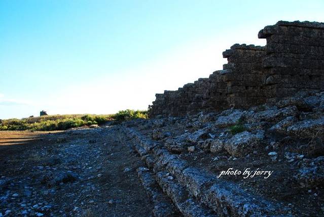 这张照片,摄于土耳其南部地中海沿岸、靠近阿斯潘多斯(Aspendos)的乡村公路边。那日,我们从内陆方向一路过来,见到阿斯潘多斯的标识后离开编号公路,似乎是进入了一个农庄,公路在黄黄的草坡中向山里延伸。土耳其多山,即使像这里离海边不过十来公里的地方,也是山山环绕。我们将车停靠在了路边的一处建筑遗址边上,这应该是古城遗址的一个线索了。