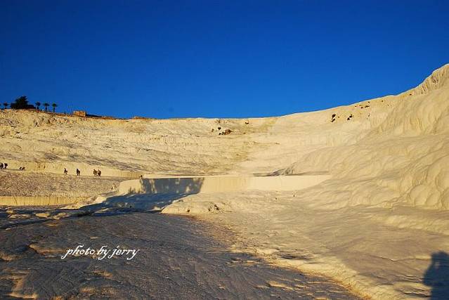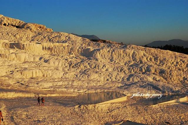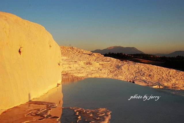 山坡上覆盖着白色钙化岩的棉花堡景区,在夕阳下披上了一层金色的光辉