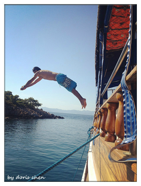 对于此次的包船,我们的要求很简单,不需要什么12岛巡航,只要找两个漂亮的地方玩水就好了 ,船老大就把我们拉到一个很美的海湾,开始嬉水啦~ 小哥为了在女孩子们面前表现下,率先来了个漂亮的入水