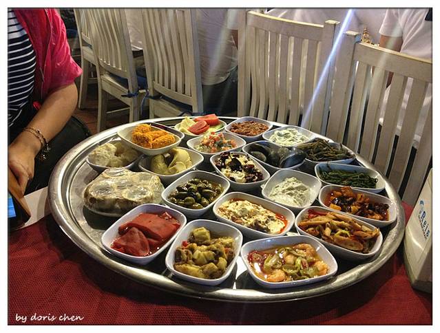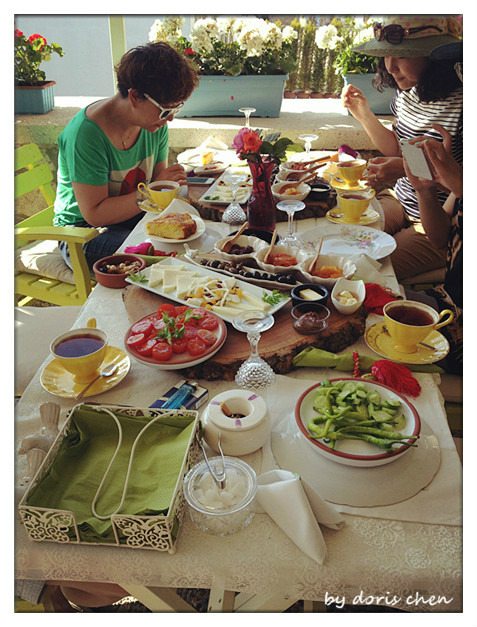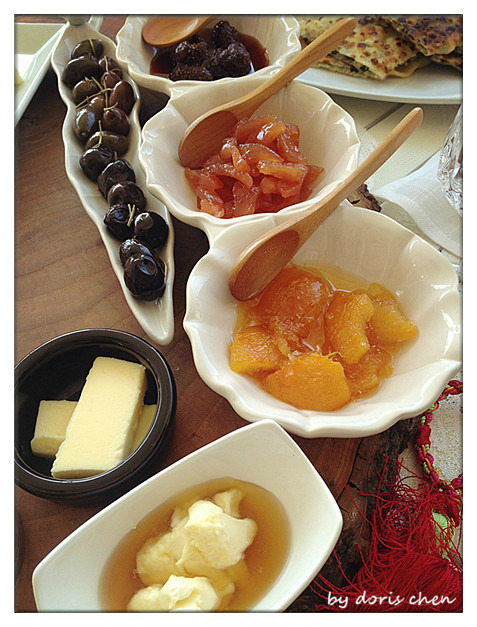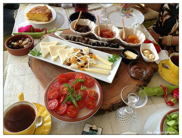 早餐,仅仅是调味品就这么丰盛,这还不算多的,发现土耳其的前菜花色品种多得超出想象,往往一个人根本吃不完