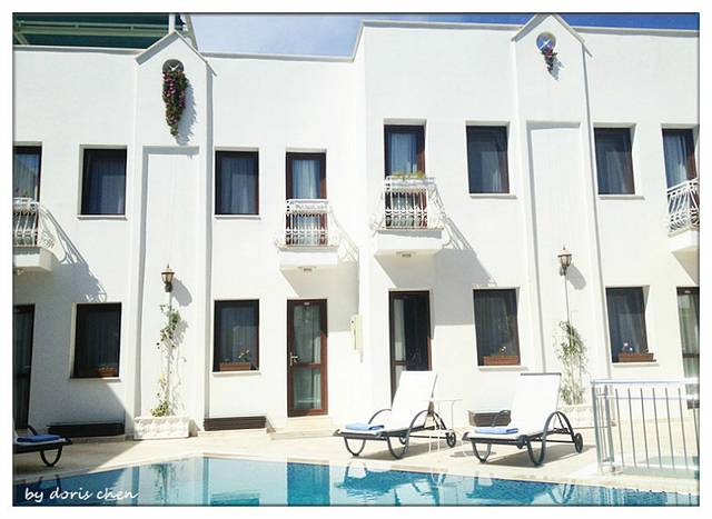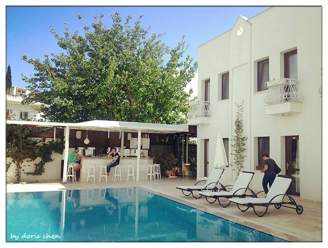 很袖珍的一家小酒店,也是雪白的房子,一个不算小的泳池,一切安顿完毕,在泳池边的小酒吧喝着酒店24小时供应的茶点,美!