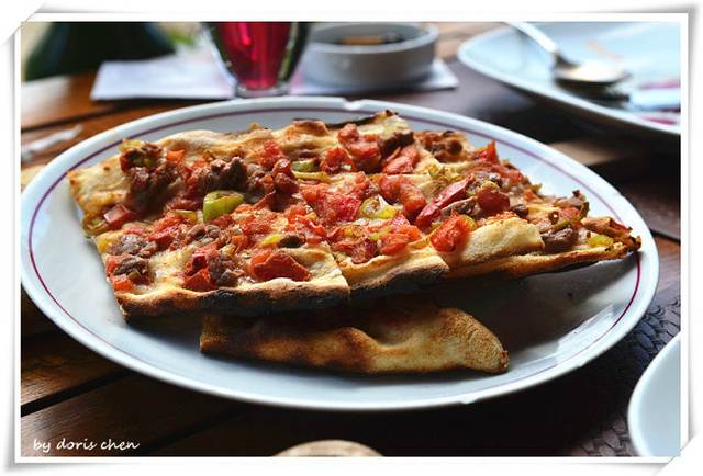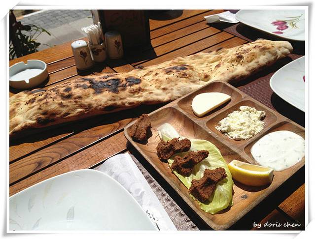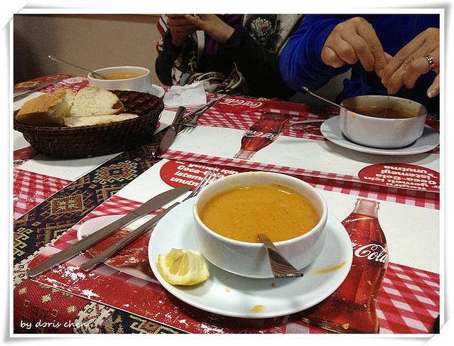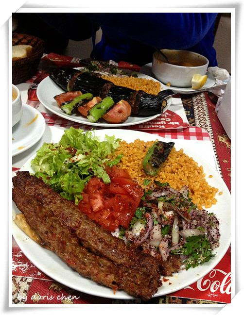 汤,没弄错的话,应该叫“Ezo Gelin corbasi",是用洋葱、小麦、红扁豆熬制的浓汤,非常美味,此后这个汤伴随了我们一路,逢餐必点,忘了名字没有关系,只要说是”汤“,上来的基本就是这个,随着地方的不同,口味稍有变化,但都一如既往地美味.