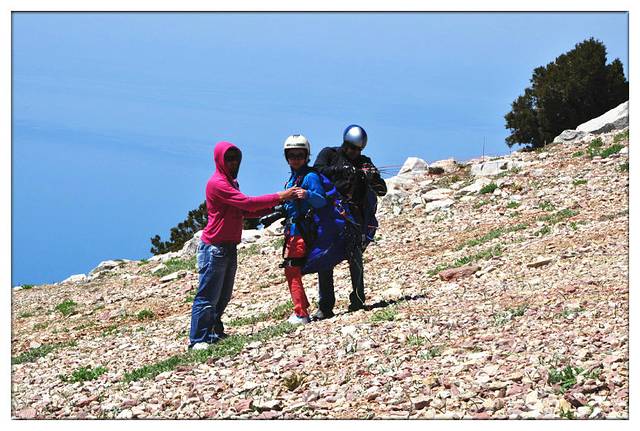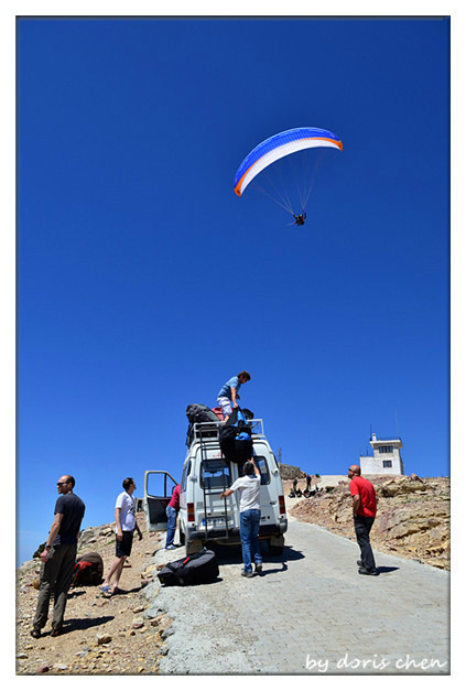 滑翔伞公司准时到酒店来接,我和舞蝶两个打死也不飞的人也跟着屁颠屁颠地去凑热闹,车开了将近40分钟到达他们的办公室才知道昨天的沟通有误,三个人订成了两个,于是海婆和小妖义无反顾地冲在了前面,因为上山的车已满员,我们只能在下面等.
