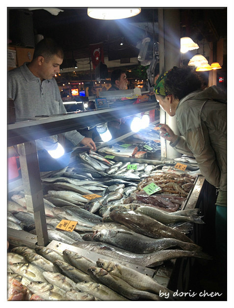 挑选食材的任务就交给了在海边长大的海婆,在不同的摊位精挑细选地买下了3条鱼(13TL),3只鱿鱼(20TL),10只左右的虾(20TL),3只螃蟹(10TL),便宜哇~