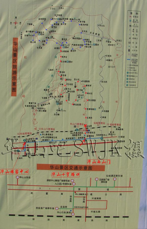 (2)华山北站出站后沿着华岳路南行10分钟,遇到第一个大十字东北角就是汽车站,汽车站有至罗敷的公交经停华山玉泉院下面的大十字,票价2-3元,用时10分钟。