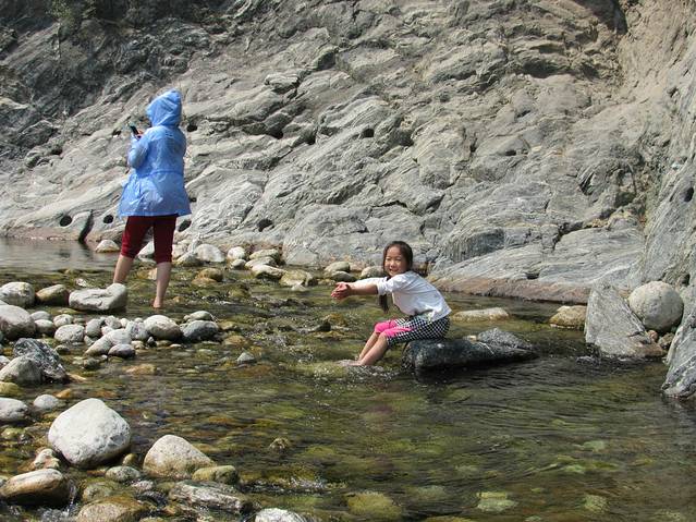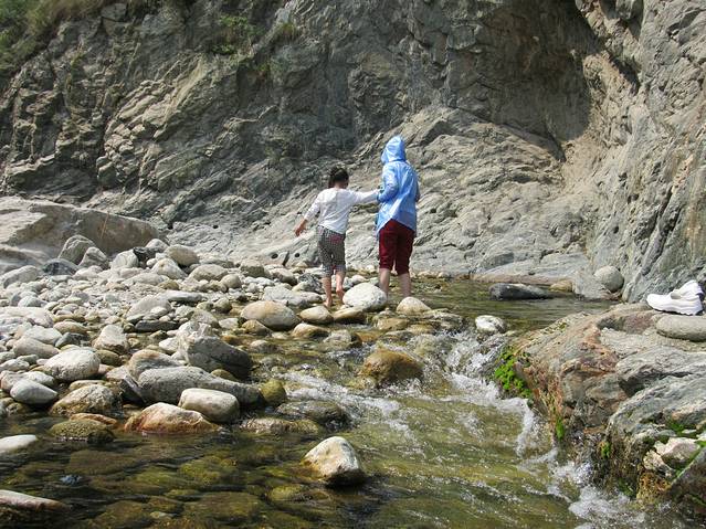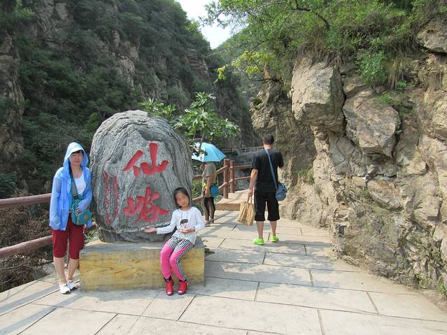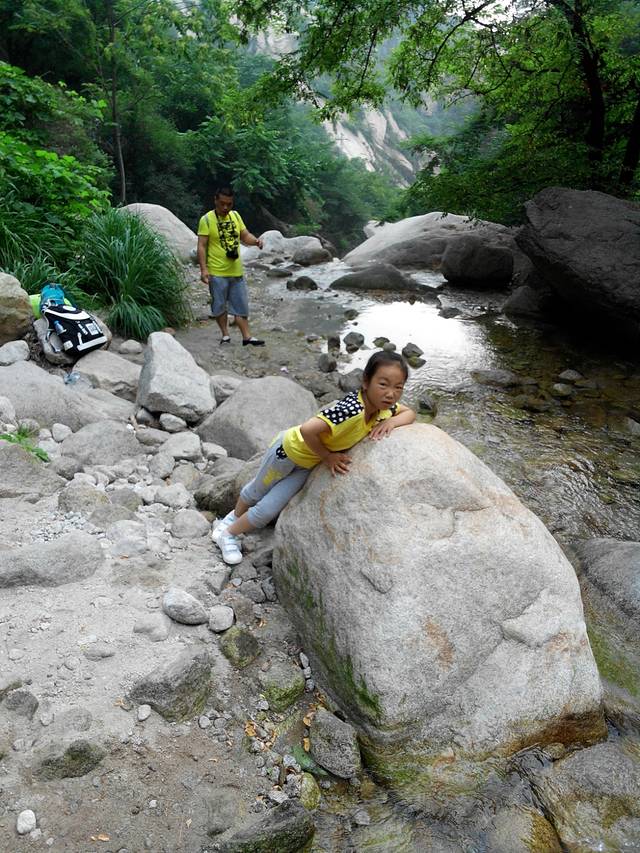 这里就是仙峪的入口了。画面中间穿小红鞋的就是我们坑呆萌的队长--小语。9岁的队长明天即将带领我们步行登顶华山。(@﹏@)~