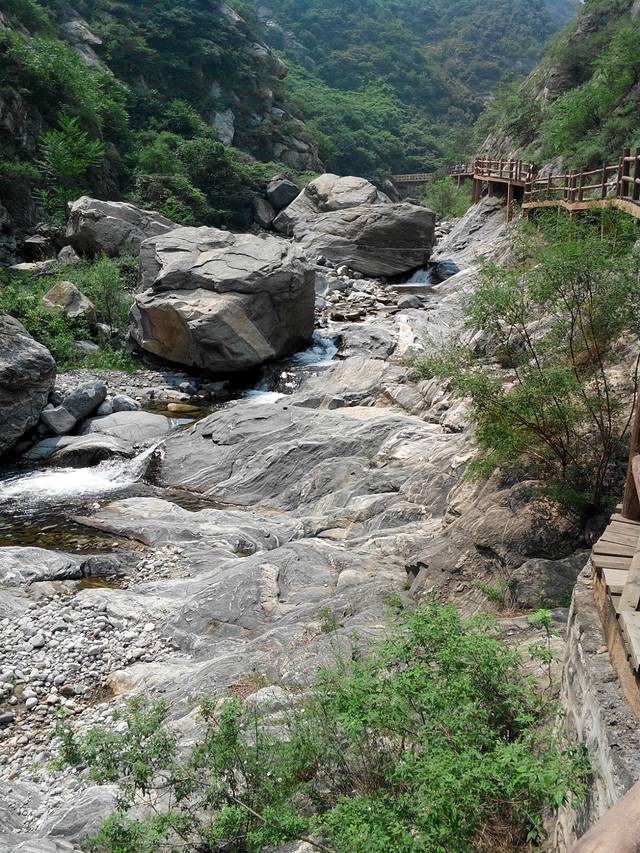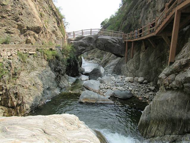 仙峪,又名车箱谷,在华山峪西,与华山峪仅一岭之隔,传说古时黄初平、黄初起弟兄在此牧羊成仙,因而得名。仙峪深五十余里,峪道窄狭清幽,山路崎岖蜿蜒,河流湍急,山石险峻,多处路段凿崖,加栈凌空通过。进峪五里处,有斜岭横阻,令人有谷尽路绝之感,然越岭横度,又平添柳暗花明的情趣。